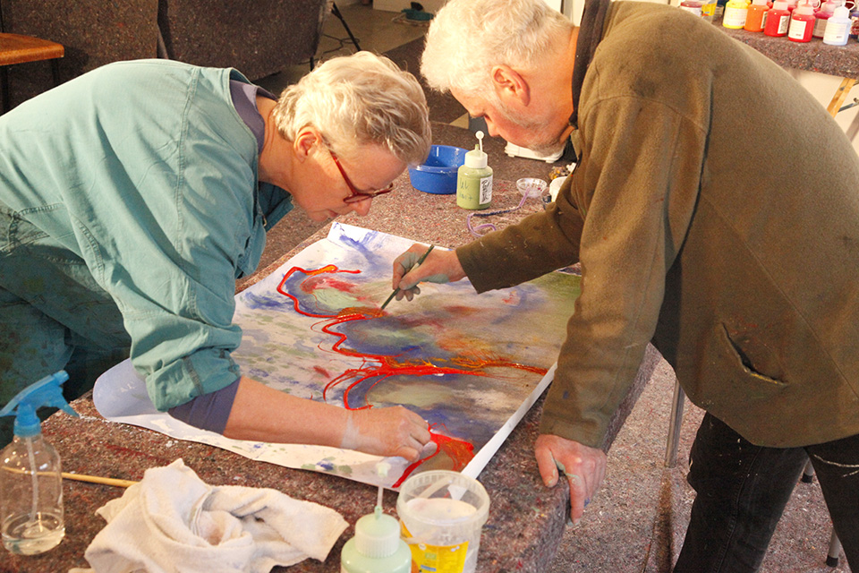 Bei dieser gemeinsamen Arbeitsweise ist die größte Herausforderung noch einmal mehr, bewusst die eigenen Fixierungen - nämlich den inneren und äußeren Raum „füllen“ zu wollen – aufzugeben; stattdessen den Raum sowohl innerlich als äußerlich „zu lassen“, damit sich ein Bild entwickeln kann. Es scheint möglich, einen Schritt auf die Erschaffung von etwas zu zugehen, wenn „wir Raum lassen“, so dass „es geschehen“ kann.