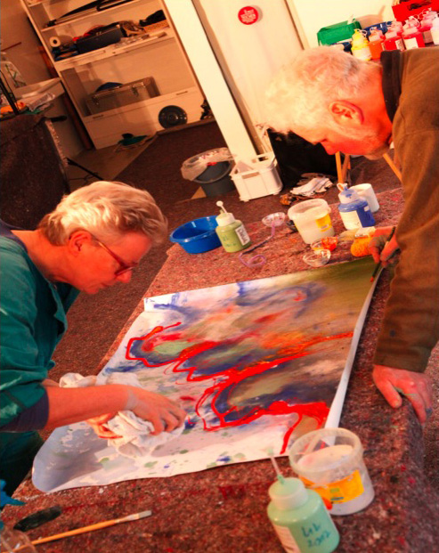 Die künstlerische Arbeit basiert in erster Linie auf praktischer Erfahrung und dem Erforschen des kreativen Geschehens selbst. Dabei treten Uta Krellenberg und Wimmer Wilkenloh auch als Archetyp »Frau - Mann« miteinander in einen künstlerischen Prozess ein, bei dem abwechselnd oder gleichzeitig an einem Bild gemalt wird.